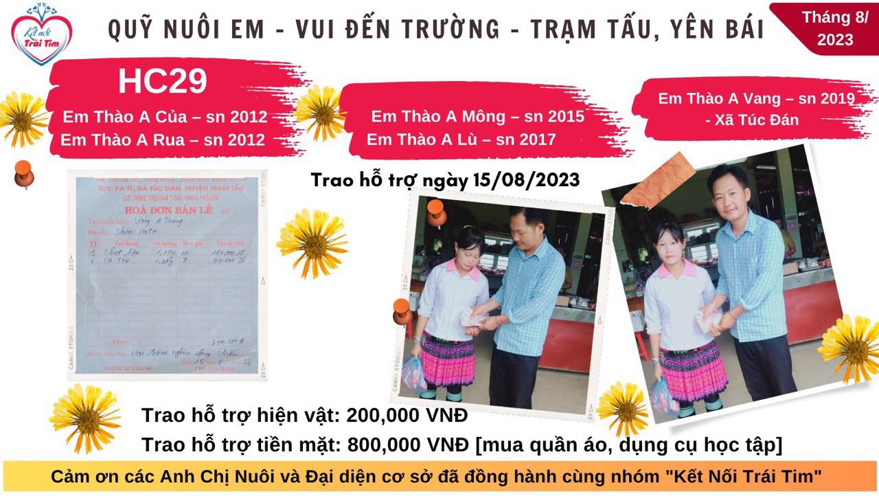 Một số anh chị nuôi có tặng thêm kinh phí để các em chuẩn bị đầu năm học mới, chúng em cũng đã trao đủ và có ảnh báo cáo chi tiết ạ!
